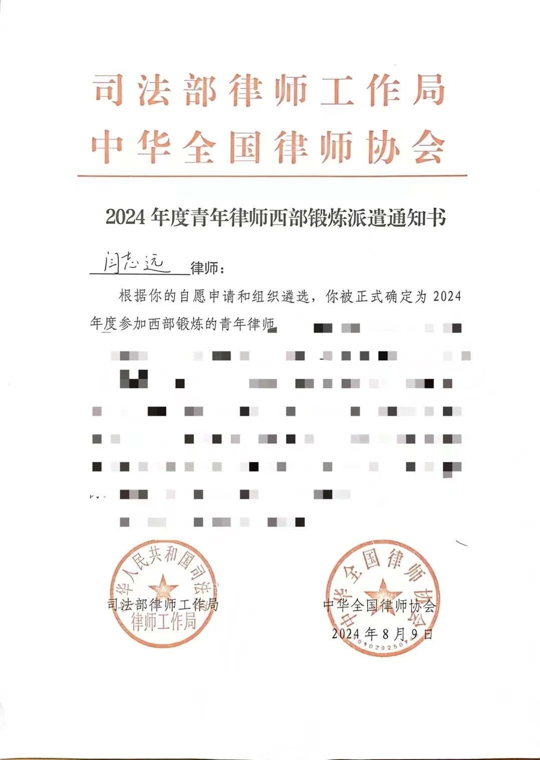 在司法部统一部署下,为深入贯彻习近平总书记关于律师工作的重要指示精神,积极响应司法部党组提出的“五点希望”,上海天知澜律师事务所的青年才俊闫志远律师于8月9日成功入选2024年度青年律师西部锻炼计划,即将踏上前往西部地区的征程,为当地法律服务事业贡献自己的力量。